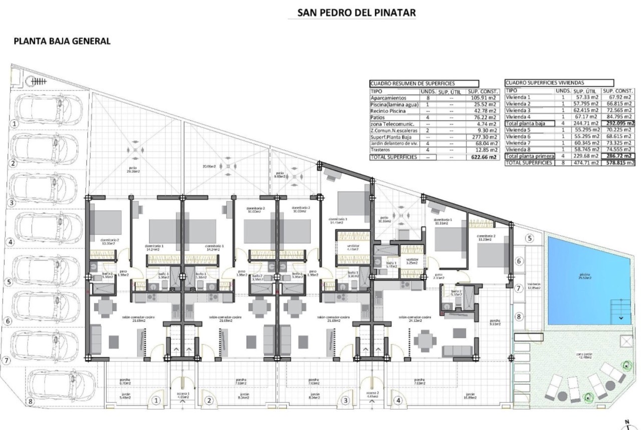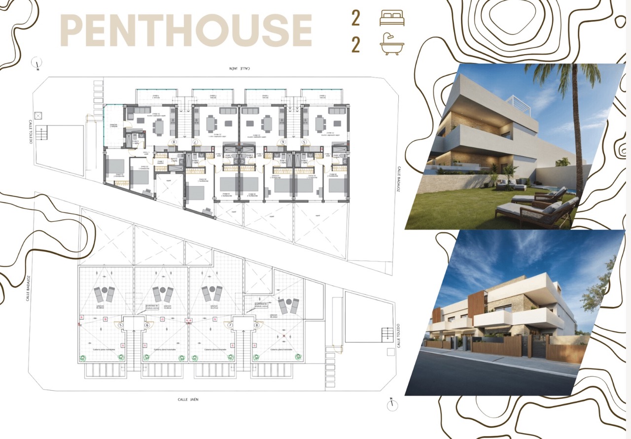 Nowe bungalowy w San Pedro del Pinatar – zaledwie 500 m od plaży. Odkryj ekskluzywny butikowy projekt ośmiu nowoczesnych bungalowów w sercu San Pedro del Pinatar, zaledwie 500 metrów od plaż Mar Menor. Te stylowe domy oferują idealne połączenie współczesnego designu i życia na wybrzeżu. Projekt obejmuje dwie opcje modelu: model Garden/Ground Floor, który obejmuje przedni taras i przestronne tylne patio do wypoczynku na świeżym powietrzu, oraz model Penthouse Loft, który oferuje prywatne solarium na dachu i przedni taras z otwartymi widokami. Każdy dom oferuje przestronne wnętrza z otwartym planem z naturalnym światłem, dwie sypialnie, w tym sypialnię główną z łazienką oraz w pełni wyposażoną kuchnię z nowoczesnymi urządzeniami. Dodatkowe udogodnienia obejmują prywatne przestrzenie zewnętrzne, takie jak tarasy i solaria, wspólny basen z zagospodarowanymi ogrodami, klimatyzację, oświetlenie LED i wyznaczone miejsca parkingowe.